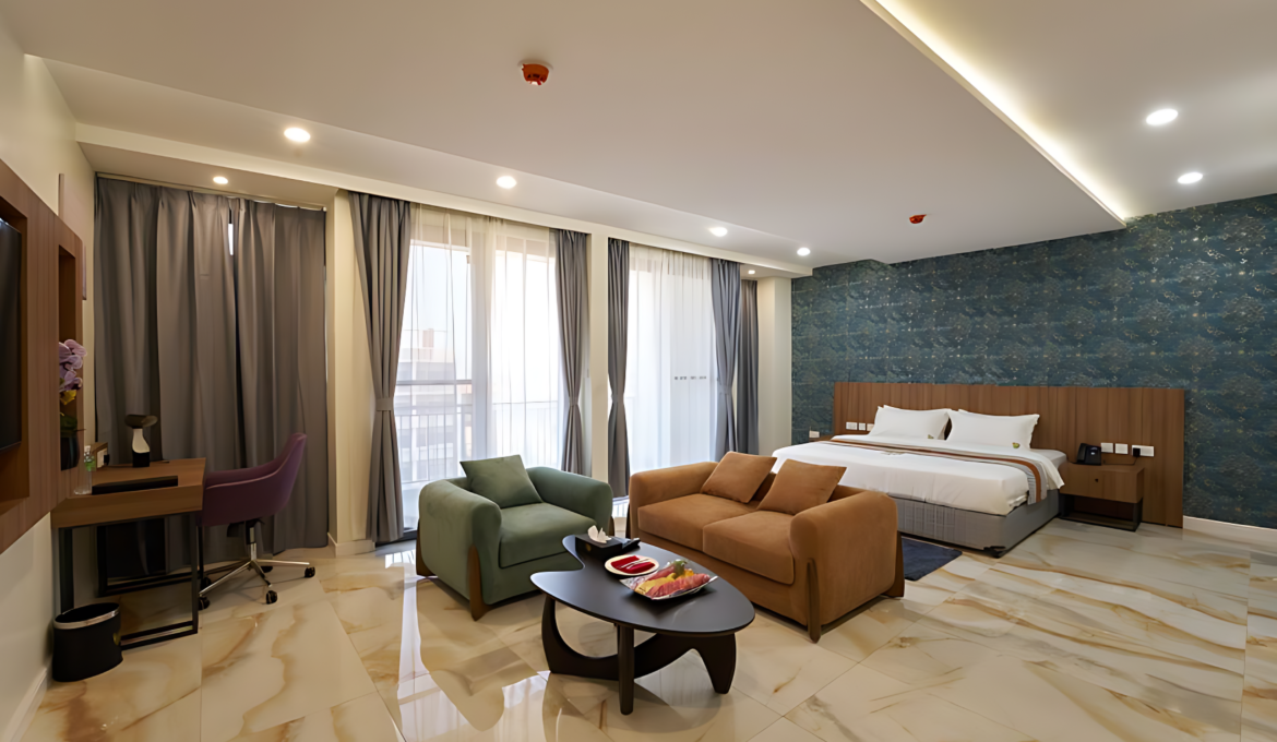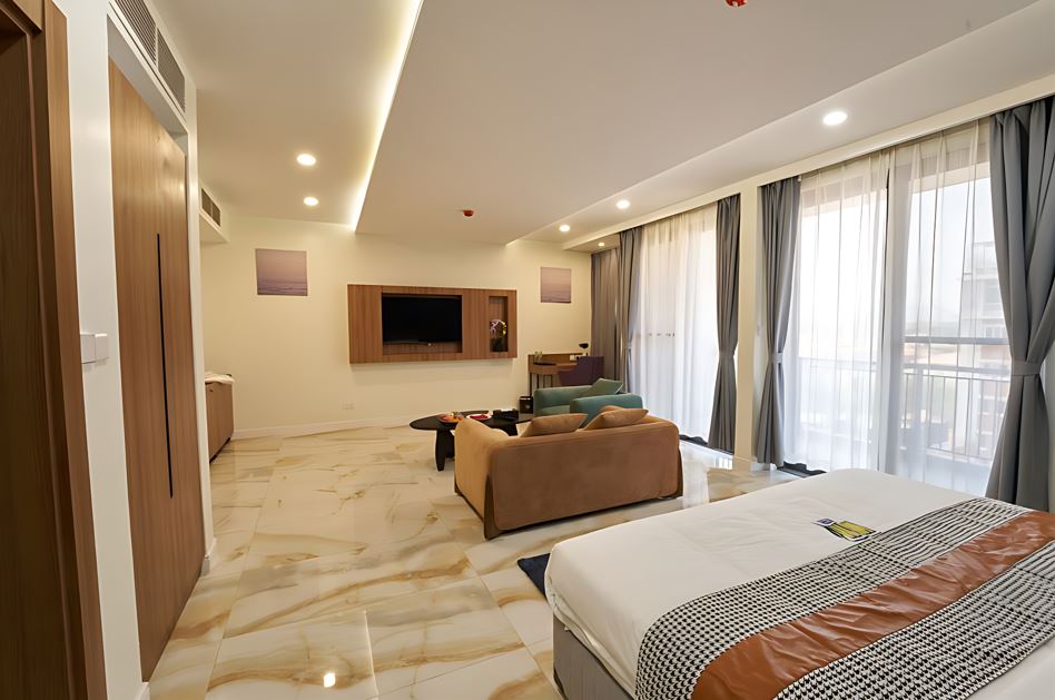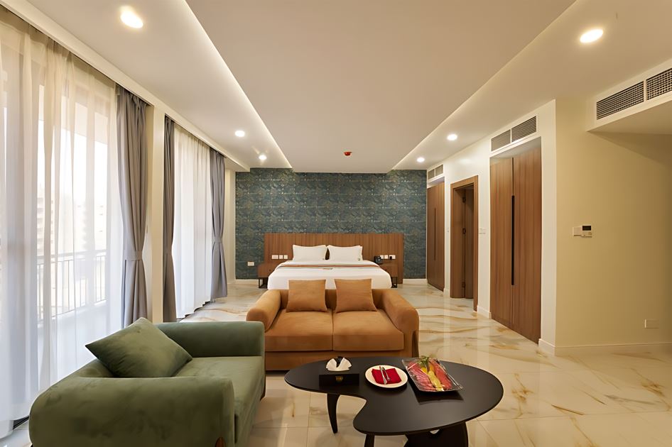 Experience the pinnacle of luxury and sophistication in our Executive Suites. Thoughtfully designed for comfort and elegance, these spacious suites feature modern décor, double balconies offering breathtaking views, a separate living room, and a fully equipped mini kitchen for added convenience.