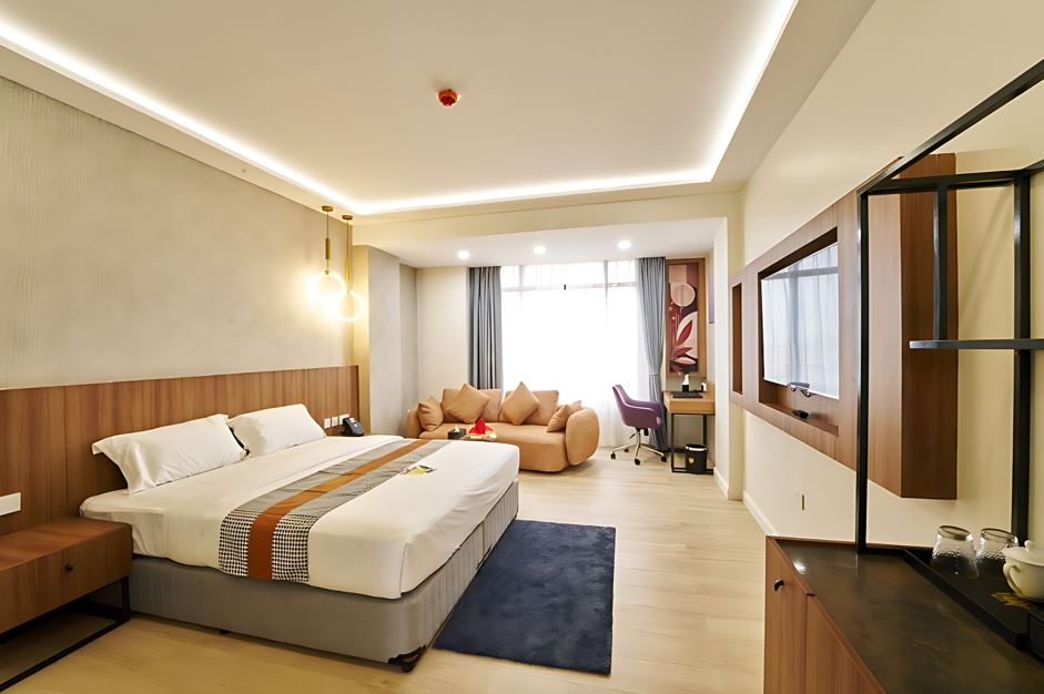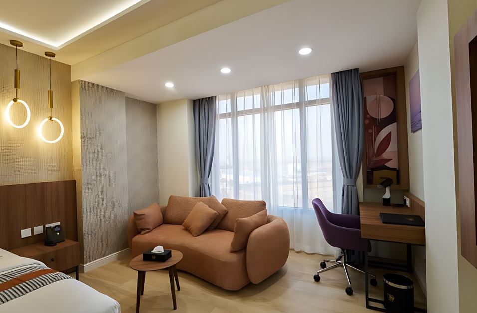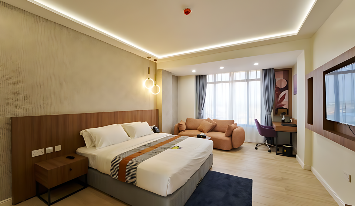 The mini kitchen allows for light meal preparation, while the executive bathtub offers a touch of indulgence. Perfect for solo travelers or couples looking for a refined stay in Juba.